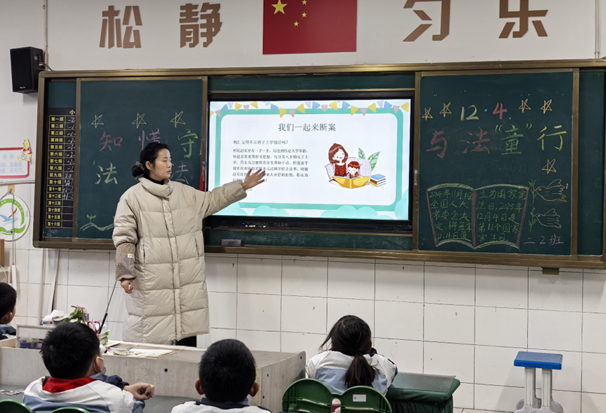 主题班会现场,各班级以生动多样的形式解锁宪法知识。辅导员老师结合小学生的认知特点,将抽象的宪法条文转化为贴近校园生活的案例,通过“宪法知识快问快答”“法治情景小讨论”等互动环节,引导同学们认识宪法的根本地位,了解宪法如何保障大家的受教育权、人身权等基本权利。“宪法不是冷冰冰的文字,它就像我们的守护者,保护我们安心上学、快乐成长”。