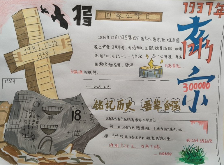 除默哀外,学校还围绕国家公祭日主题,布置了针对性强、形式多样的学习实践任务,引导学生深入学习历史、感悟精神。活动要求全体学生主动阅读浏览国家公祭日相关文章、视频,系统了解南京大屠杀的历史背景、30万遇难同胞的惨痛史实,深刻领会国家公祭日设立的深远意义,在学习历史的过程中提升文学素养与思想觉悟。