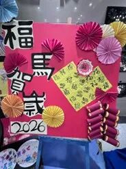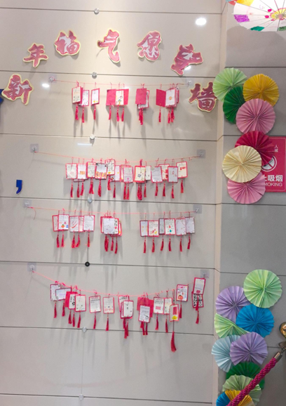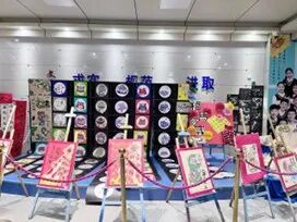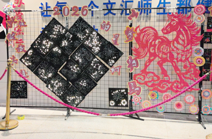 本次美术展的展区布置独具巧思,处处洋溢着新年氛围与艺术气息。红彤彤的心愿卡串着红流苏垂挂而下,成为一道别致的“新年祝福墙”;五彩纸扇、缤纷灯笼与手绘油纸伞装点在展厅上空,将艺术空间衬得绚丽多姿。展区内还设置了网格展示墙,2026数字装饰与闪耀的烟花造型装置相映成趣,大红的奔马图案栩栩如生,文曲星立体手作憨态可掬,让整个展区既充满艺术感,又满是新年的热闹与温馨。